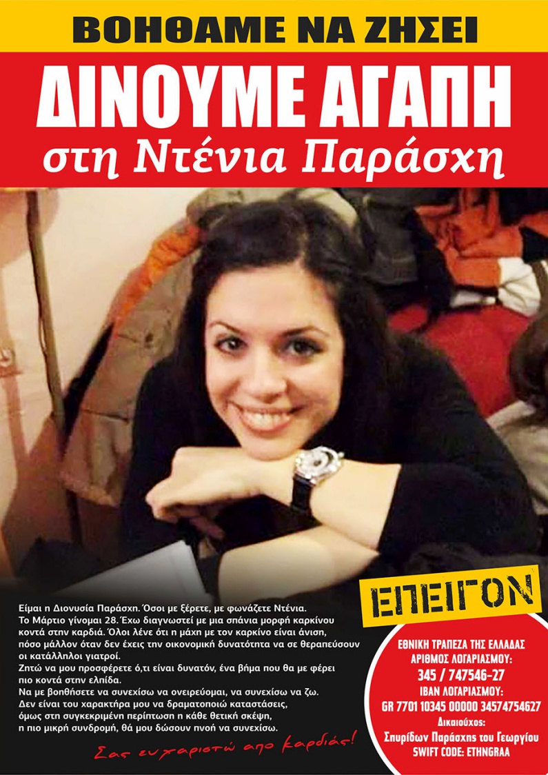 «Είμαι η Διονυσία Παράσχη. Όσοι με ξέρετε, με φωνάζετε Ντένια. Το Μάρτιο γίνομαι 28. Έχω διαγνωστεί με μια σπάνια μορφή καρκίνου κοντά στην καρδιά. Όλοι λένε ότι η μάχη με τον καρκίνο είναι άνιση, πόσο μάλλον όταν δεν έχεις την οικονομική δυνατότητα να σε θεραπεύσουν οι κατάλληλοι γιατροί. Ζητώ να μου προσφέρετε ότι είναι δυνατόν, ένα βήμα που θα με φέρει πιο κοντά στην ελπίδα. Να με βοηθήσετε να συνεχίσω να ονειρεύομαι, να συνεχίσω να ζω. Δεν είναι του χαρακτήρα μου να δραματοποιώ καταστάσεις, όμως στη συγκεκριμένη περίπτωση η κάθε θετική σκέψη, η πιο μικρή συνδρομή, θα μου δώσουν πνοή να συνεχίσω. Σας ευχαριστώ από καρδιάς!»